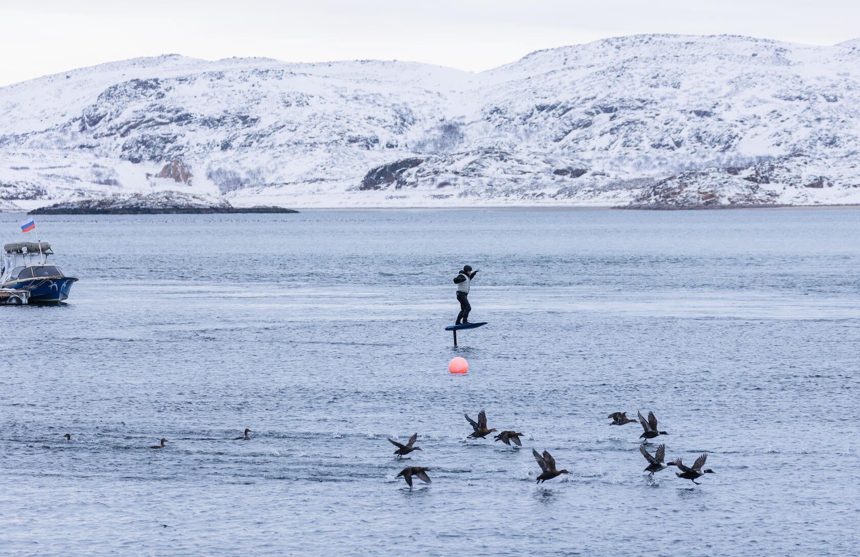 Весной для теста привезли несколько вариантов антишоковых спасательных жилетов в разных цветах, но в окружении арктических уток бежевый жилет так органично вписался, что полученный экспириенс мы стали развивать дальше.